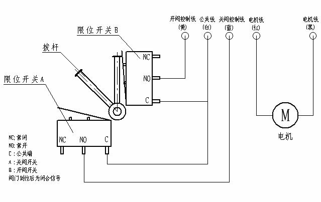 4)執(zhí)行機構(gòu)引出線中:黑色線為電機正極引出線,紅色線為電機負極引出線,黃色線為開閥到位引出線,藍色線為關(guān)閥到位引出線,白色線為閥到位公共線。