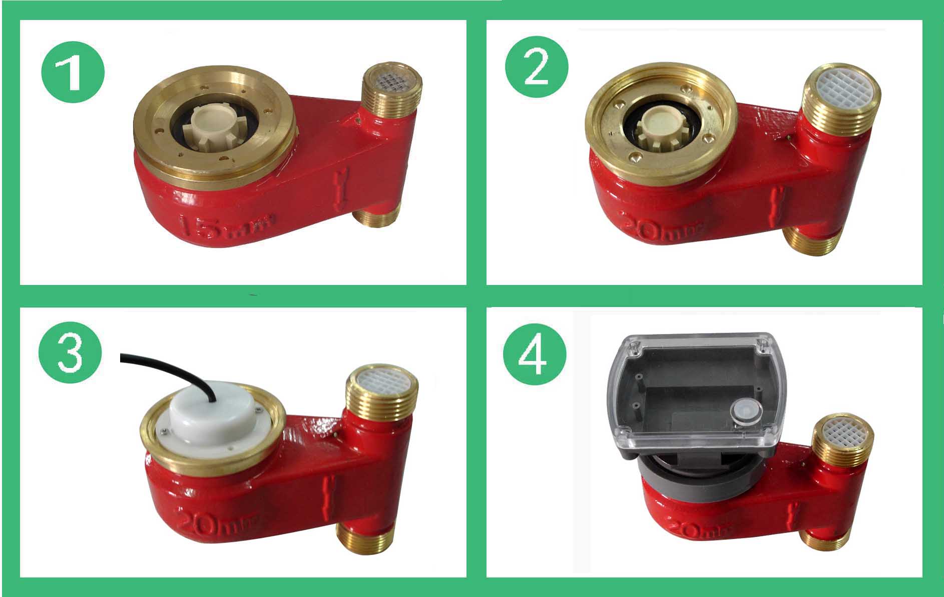 DS97TAR多流束有磁熱量表流量計(jì)的結(jié)構(gòu)如圖,其工作原理是:熱水進(jìn)入流量計(jì),經(jīng)進(jìn)水導(dǎo)向孔沖擊計(jì)量腔內(nèi)的葉輪旋轉(zhuǎn),再經(jīng)出水導(dǎo)向孔流出流量計(jì)。葉輪上面嵌有磁鋼隨葉輪旋轉(zhuǎn),在隔板上端的韋根遠(yuǎn)傳組件,接受葉輪旋轉(zhuǎn)的周期信號(hào)。其殼體采用優(yōu)質(zhì)黃銅,經(jīng)鑄造、數(shù)控機(jī)床和組合機(jī)床加工,機(jī)械強(qiáng)度好、尺寸精度穩(wěn)定一致,塑料零件選用進(jìn)口的高強(qiáng)度耐熱工程塑料,密封件采用優(yōu)質(zhì)耐熱材料。因此,該流量計(jì)完全能夠適應(yīng)國(guó)內(nèi)供熱系統(tǒng)的惡劣工作環(huán)境。